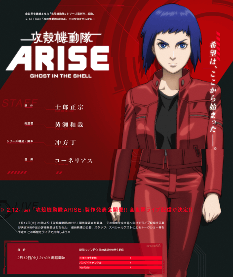 http://uewomuitearuku.blog.shinobi.jp/%E3%82%A2%E3%83%8B%E3%83%A1%EF%BC%88tv%EF%BC%86ova%E3%81%AE%E6%84%9F%E6%83%B3%EF%BC%8B%E6%83%85%E5%A0%B1%EF%BC%89/%E6%96%B0%E4%BD%9C%E3%82%A2%E3%83%8B%E3%83%A1%E3%80%8E%E6%94%BB%E6%AE%BB%E6%A9%9F%E5%8B%95%E9%9A%8A%20arise%E3%80%8F2013%E5%B9%B4%E5%A7%8B%E5%8B%95%EF%BC%81新作アニメ『攻殻機動隊 ARISE』2013年始動!草薙素子の最新ビジュアル初公開!