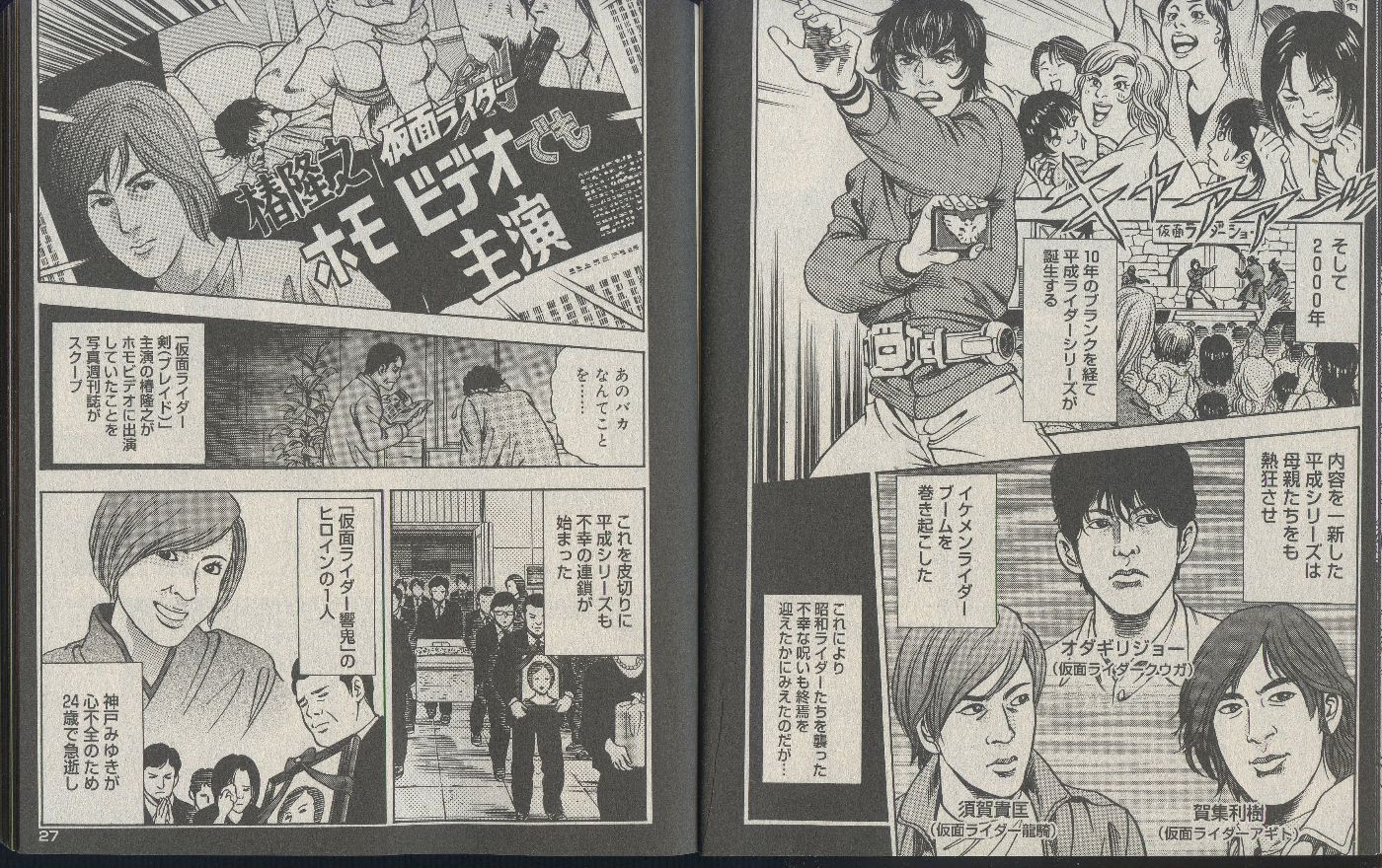 ・上のマンガでの仮面ライダーブレイド剣崎役の椿くんホモAV出演発覚事件。